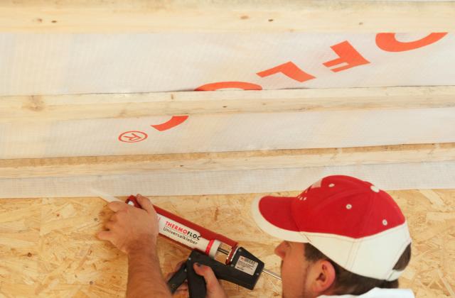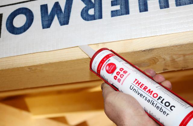 THERMOFLOC Dampfbremsvliese werden durch Tackern oder Kleben an der Unterkonstruktion befestigt, wobei die Folienseite zum Raum hin orientiert ist. Bei Einblasdämmstoffen wiederum ist eine Längsverlegung des Dampfbremsvlieses zu empfehlen. Sollte eine Querverlegung erforderlich sein, sind die Klebebandstellen mit einer durchgehenden Lattung abzudecken, um ein Lösen des Klebebandes aufgrund des Einblasdruckes zu verhindern.
